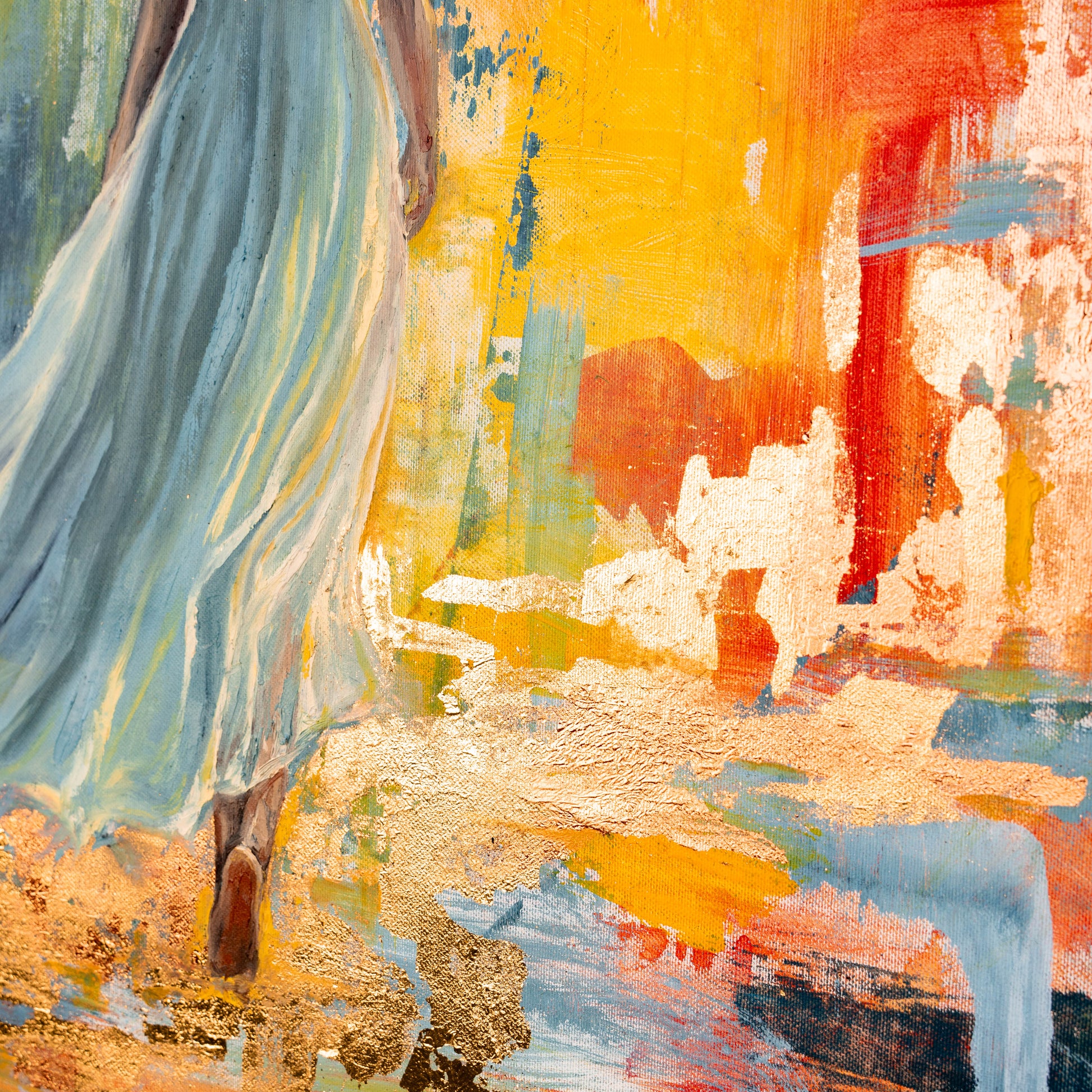 Each original painting in the Echoes of Grace series is crafted with rich oil paint layered over an expressive abstract acrylic background. Gold foil accents add a touch of radiance.