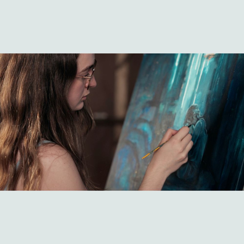Each original painting in the Echoes of Grace series is crafted with rich oil paint layered over an expressive abstract acrylic background. Gold foil accents add a touch of radiance.